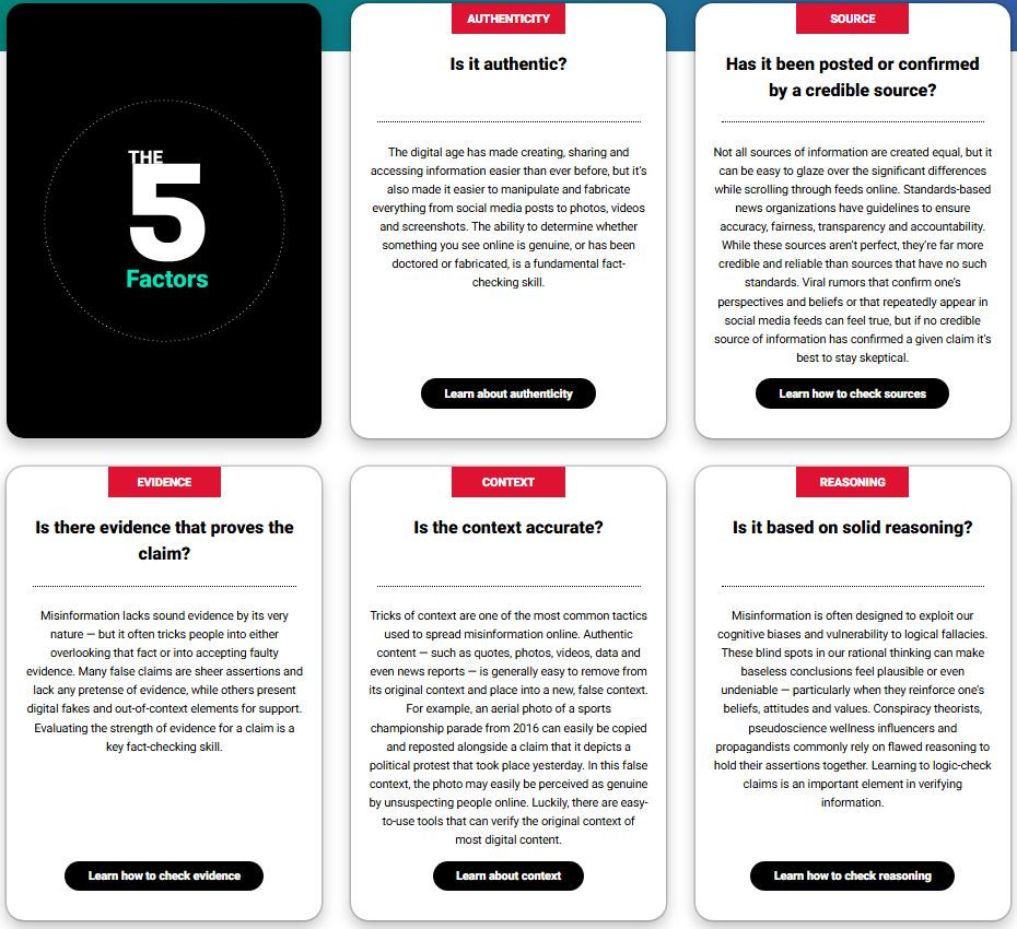 Lastly, another great function of RumorGuard is that it also hosts a breakdown of how to spot and identify misinformation. By clicking on the Factors tab at the top of the page, a 5 Factor breakdown explains what a user needs to answer before confirming whether new information is legitimate. These five factors are as follows: Authenticity, Source, Evidence and Reasoning. According to RumorGuard, to first identify a piece of potential misinformation a user should always confirm the media’s of authenticity (especially in the age of artificial intelligence), confirm that the original source of the media is credible, further fact check online to see if there is official sources with evidence backing the claim, evaluate the overall context and lastly determine if the claim made is based on solid reasoning. Because of this great breakdown on spotting misinformation, I give RumorGuard a 10 out of 10 in teaching the general public about verifying and fact checking the media they consume. It’s great way to minimize misinformation.
