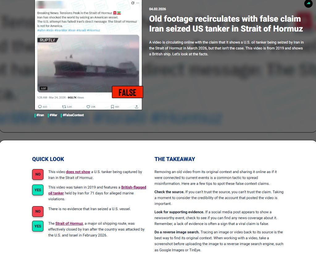 From my personal experience, Rumor Guard has been quite credible and gives a quick look at the most viral pieces of misinformation and how it is being framed. From just 2 days ago, Rumor Guard corrected popular misinformation about the sinking of a oil US tanker. They had properly identified that the video and context was actually stolen from a previous incident in 2019 and had no relation to the current state of political affairs in Iran!
